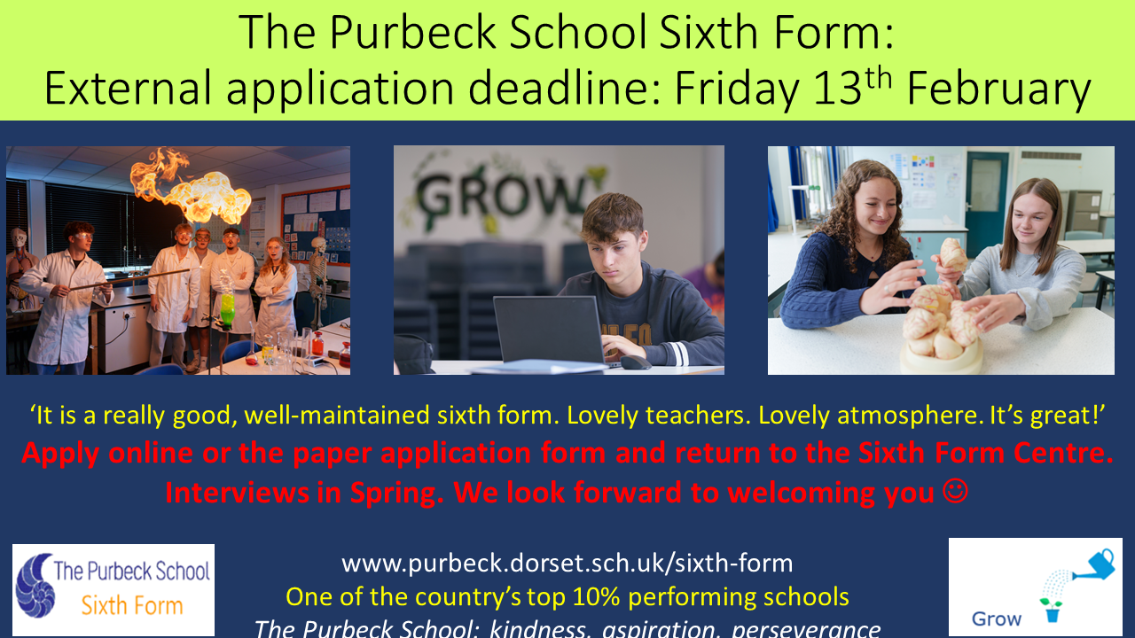 For further information please contact the school office at office@purbeck.wessex.ac on 01929 550077. Or additionally use the link below to read our Sixth Form Prospectus.